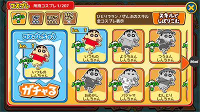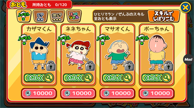 1、独创角色成长体系,每位登场人物都配备专属技能树,野原一家成员可通过收集道具解锁特殊动作,美伢的购物车冲刺、广志的公文包护盾等特色技能让跑酷过程充满策略性