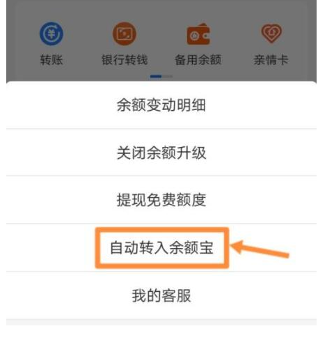 4、在展开菜单中选择「自动转入余额宝」服务设置项