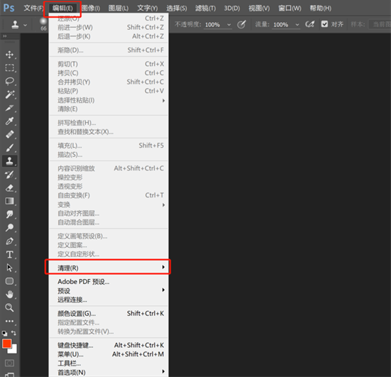 当遇到暂存盘容量警报时,可通过软件内置的清理功能快速释放空间。启动Photoshop后定位至顶部菜单栏,依次选择"编辑"-"清理"-"全部"选项。此操作可立即清除历史记录、剪贴板等缓存数据,但需注意该操作不可逆,执行前建议保存当前工作进度。