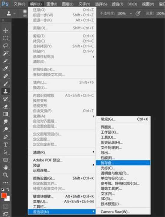 1. 进入首选项设置界面:点击菜单栏"编辑"按钮,在下拉列表中选择"首选项"-"暂存盘"选项。此界面将展示当前系统分配的存储路径及可用空间状态。