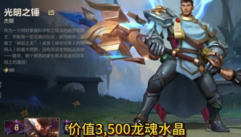 同步登场的「光明之锤-杰斯」采用圣殿骑士主题设计,银白色战甲镶嵌金色纹路,武器形态切换时会产生光效渐变效果。该皮肤定价3500龙魂水晶,在技能特效方面,电磁炮充能时会浮现符文环绕特效,近战形态的重锤落地将产生神圣印记。